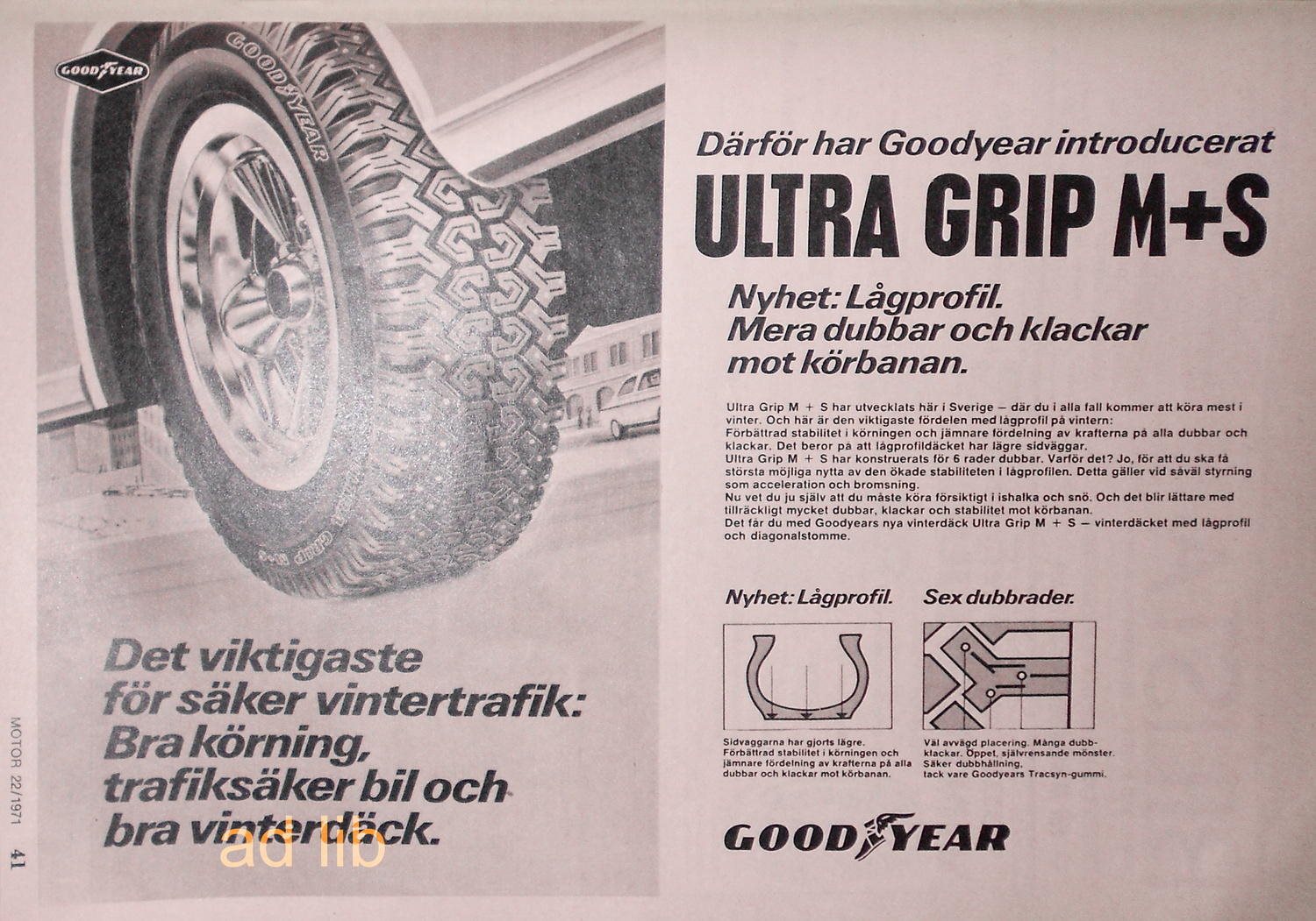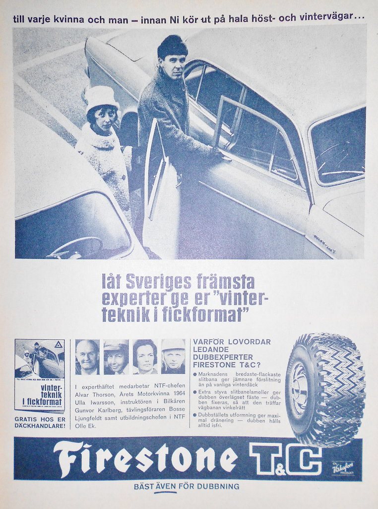 Vid tiden fanns det visserligen rätt många däckfabrikat och modeller på marknaden: många gled till exempel omkring på Firestone T & C (Town & Country), medan några kanske halkade runt på gamla Gislaved Brodd från 1950-talet. När 1960-tal övergick i 1970-tal köpte många kanske på sig en uppsättning Goodyear Ultra Grip M+S. Men dessa har jag inte funnit på andrahandsmarknaden, så i fokus här är Trelleborgsdäcket. Detta har nog för övrigt både en och annan kört omkring med på 1960-talet i den då populära dimensionen 165-15, eftersom det satt perfekt på en viss frekvent använd 4,5-tumsfälg.