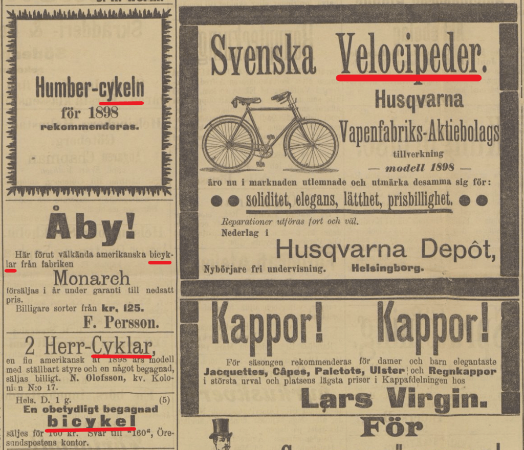 Att situationen inte var så prydlig att velociped kom 1870 och ersattes av bicykel 1883, som i sin tur trängdes undan av cykel 1891, illustreras fint av annonssidorna i dagstidningarna åren kring 1900. I samma språkliga sammanhang, i samma typ av text, på en och samma sida (sidan 4) i Öresunds-Posten den 28 maj 1898, används alla tre:
