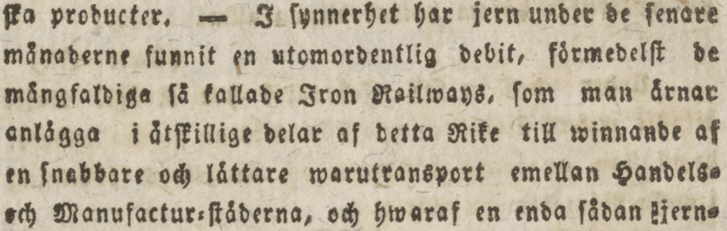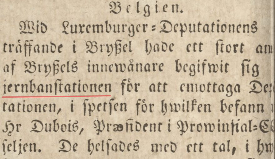Substantivet järnväg lever tidigt sida vid sida med andra ord för liknande fenomen. Järnvägen har tidigt en rätt frekvent variant i ordet järnbana, med sammansättningar som jernbanstation, här i Helsingborgsposten den 18 augusti 1838 (sidan 2):