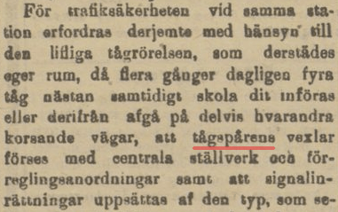 När det talas om spåren som sådana har emellertid tågspår använts en del även för ”vanlig” järnväg. Ordet lever tillsammans med det äldre järnvägsspår under delar av 1800-talet. I en artikel om arbeten på Västkustbanan (Skånska Dagbladet den 22 januari 1897, sidan 2) talas det bland annat om tågspårens vexlar:
