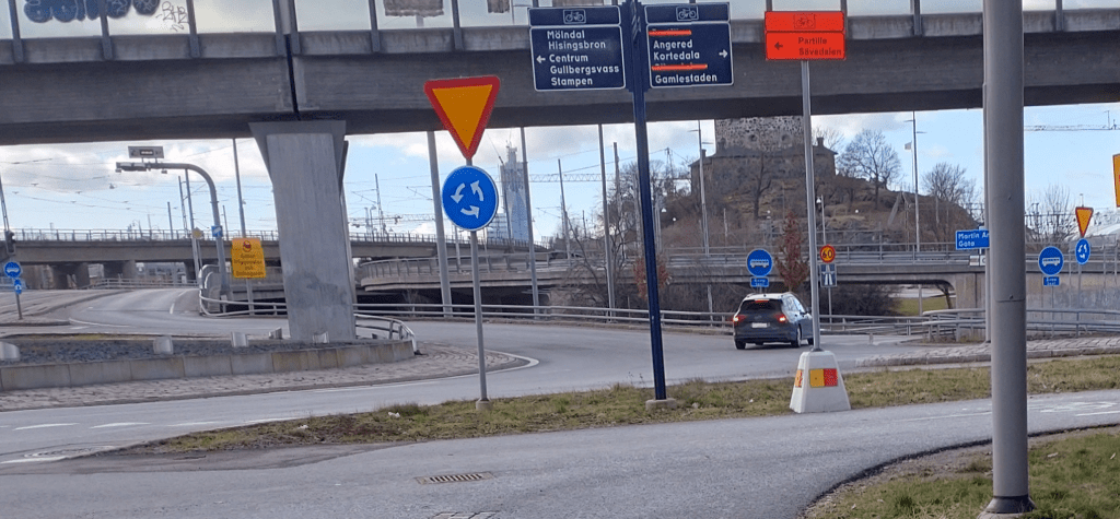 Men motorvägspåfarten till E6 skyltas alltså med blå påbudsskylt. Varför?Jag bara gissar, men kan det vara så att vi har minst två problem här?