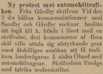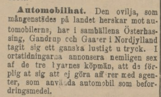 Framför allt verkar det vid denna tid ha protesterats mot bilen på landsbygden. Den vilda automobilframfarten ansågs där vara ett hot mot framför allt hästtrafiken, både kommersiellt och trafiksäkerhetsmässigt. (Det ska sägas att djurskyddsargument fördes fram i bilens favör, men dessa argument fördes inte främst fram av hästägarna.)