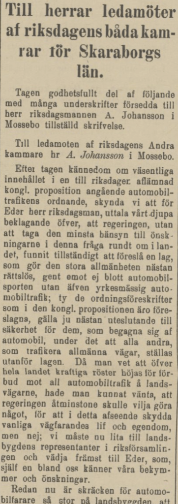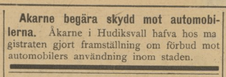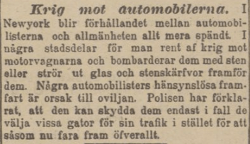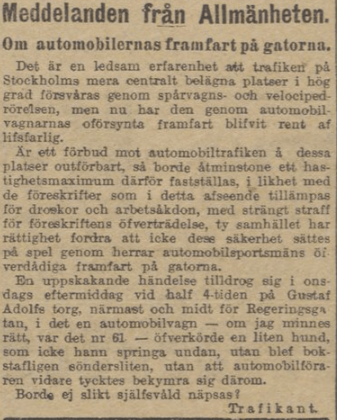 Att velocipeden med sin ljudlösa framfart skapat oro på 1880-talet är välkänt. Men i fråga om automobilen verkar rädslan ha varit intensivare och kommit till uttryck i såväl vandalisering som krav på bilförbud i hela samhällen. Detta vittnar nedanstående insändare i Dagens Nyheter den 9 oktober 1905 (s. 3) om. Spårvagnar och velocipeder ansågs visserligen problematiska av vissa, men automobilerna hade gjort trafiken ”rent af lifsfarlig”: