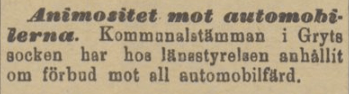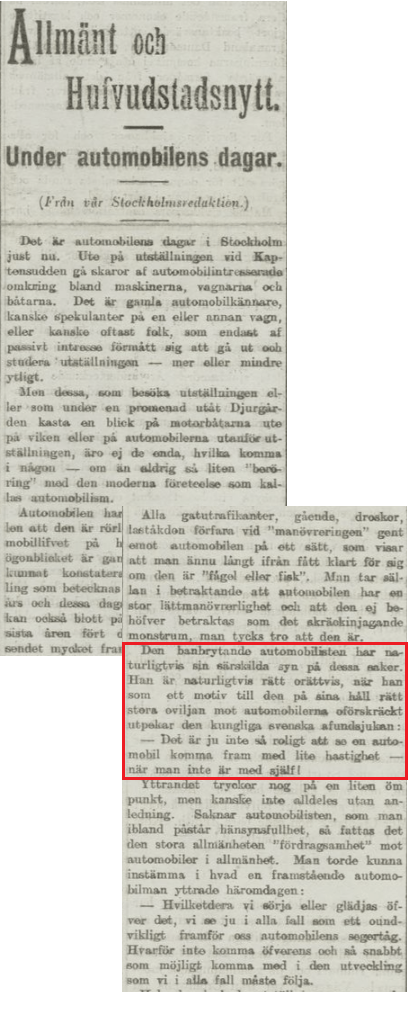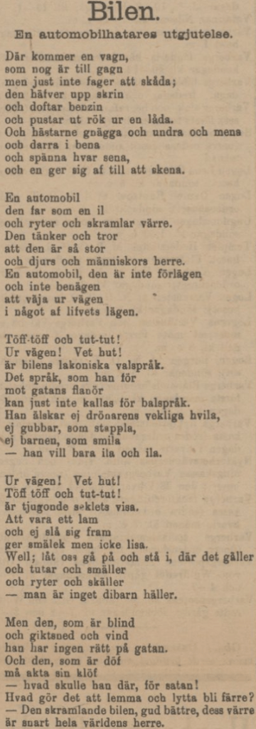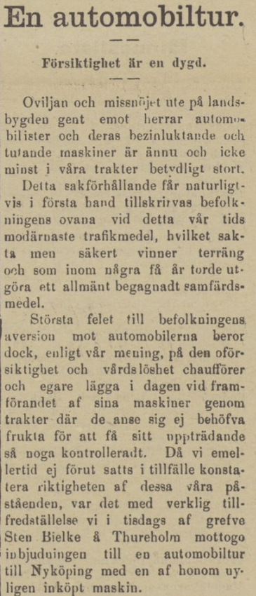 Vid förra sekelskiftet var automobilen fortfarande något sällsynt och märkvärdigt i Sverige, och dess blotta uppenbarelse blev nyhetsmaterial (i Sverige sågs den första förbränningsmotordrivna ”bilen” först 1891). Det närmaste tekniska påfund som jag kommer på som skulle motsvara nyhetsintresset under senare tid är smartphonen, som dök upp 2007. I fråga om åsiktspolarisering torde dock automobilens inträde närmast kunna jämföras med hyr-elsparkcyklarnas kring 2019.