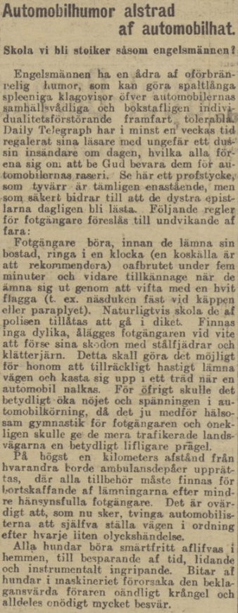 Kanske finns något att lära av de brittiska dystra epistlarna från 1906, där man förutspår att de oskyddade trafikanterna kommer att komma i andra hand i trafikmiljön och bland annat ironiskt föreslår att fotgängarna ”tillkännage när de ämna sig ut genom att vifta med en hvit flagga”.