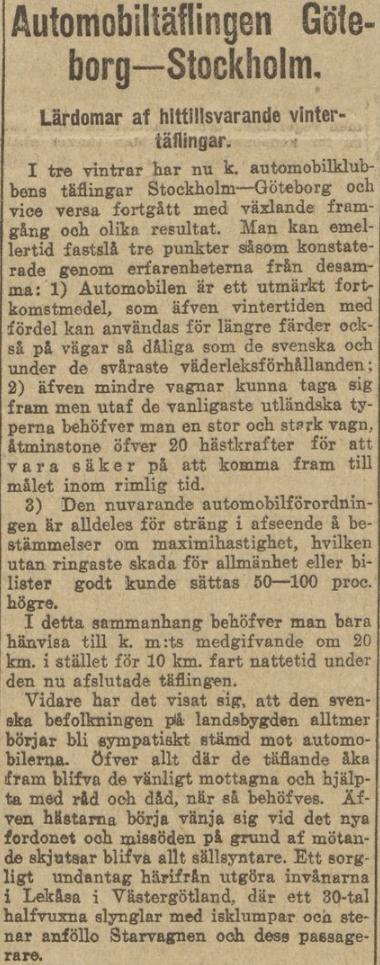 Dessutom var landsvägarna inte i bästa skick. Eftersom de skapats för andra trafikslag än bilen, var bilens plats allt annat än given. Trots ansökningar från flera automobilintressenter avslogs tillstånd för biltrafik på löpande band: