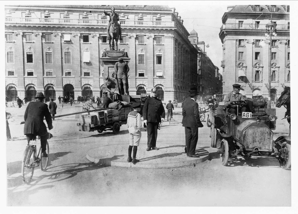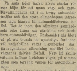 Under denna tid rådde alltså, liksom i dag, ett kännbart konkurrensförhållande om utrymme mellan bilen och andra trafikslag. Nu är vi också tillbaka ett par år före den första ”trafikförordningen” och ca 50 år innan motorfordonen tilldelades egna, reserverade ytor att föras på. Redan efter några år verkade infrastrukturen ha kommit ikapp och folk vant sig vid att automobilen tagit i besittning en del av den yta som andra trafikanter tidigare hade haft: