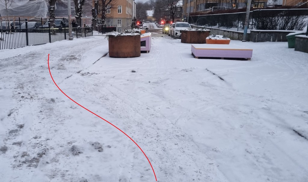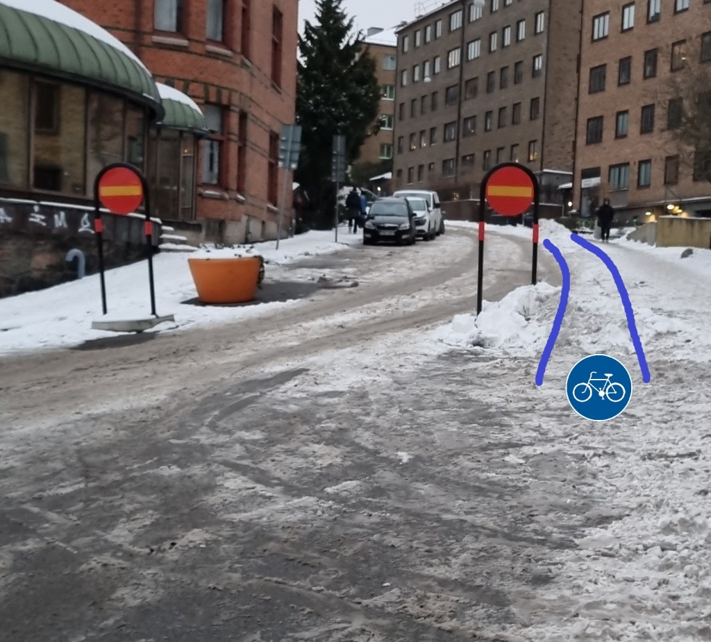 - Se även till att snöröjarna vet var cykelbanorna går och att de finser vikten av att snöröja dem. Så här ser det t.ex. ut vintern 2026: en helt bortglömd cykelbana.